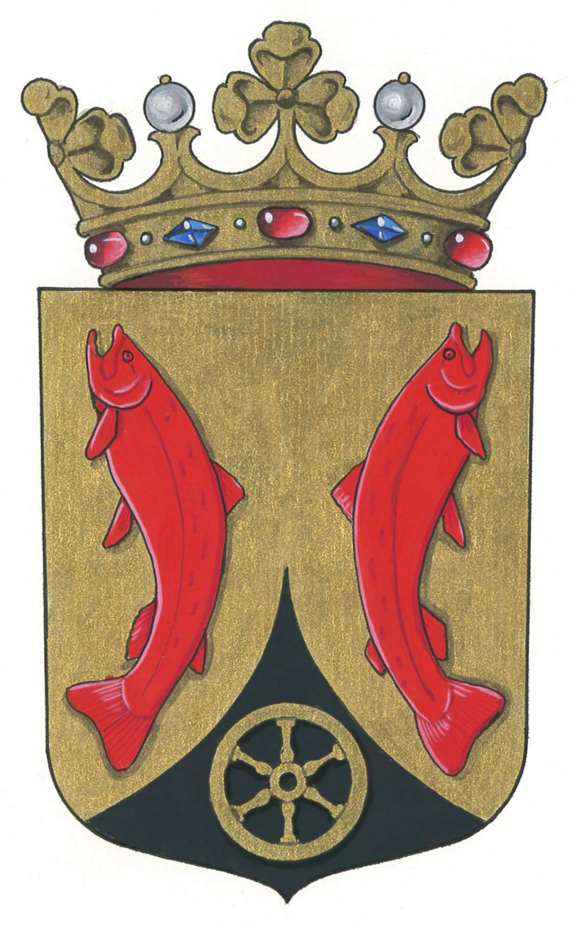 De officiële omschrijving van het wapen is: "In goud twee afgewende zalmen van keel en in een ingedreven punt van sabel een rad van goud. Het schild gedekt met een gouden kroon van drie bladeren en twee parels "