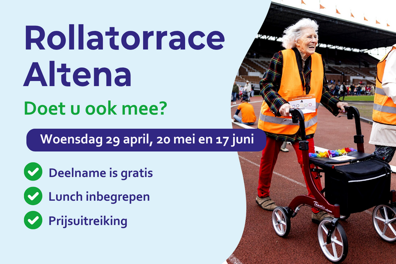 Onze sportcoaches organiseren een rollatorrace. Iedereen die is aangewezen op het lopen met een rollator, mag deelnemen aan deze race. De te lopen afstand is ongeveer 100 meter en u loopt het samen met een buddy.